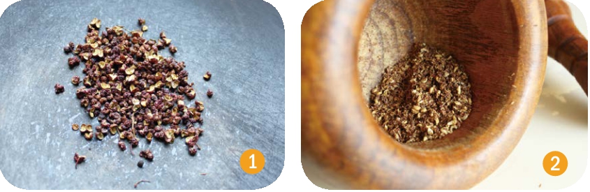 与整粒的花椒相比,花椒面更为细腻。要在家中自制花椒面非常简单:将干花椒放进锅中小火煸至颜色棕红,盛出,晾凉后捣碎即可(图12)。