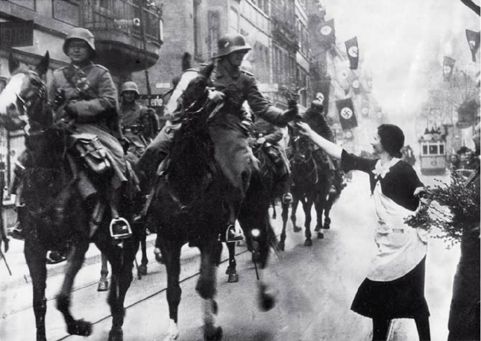 德军先头部队踢着正步开进莱茵河西岸的科隆城,当地的市民们在道路两旁欢迎着这支正在冒险的军队。尽管在整个行动中德军只出动了3万人,其中进入莱茵河西岸的只有3个营,但是英法两国却没有任何反击的勇气,英法的放纵成就了希特勒的又一次冒险。