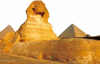 狮身人面像位于卡夫金字塔旁,是用一块建造完陵墓后剩下的巨石雕刻而成,高20米,长57米,脸长5米,头戴皇冠,两耳侧有扇状的“奈姆斯”头巾,额上刻着圣蛇浮雕,下颌有帝王的标志——下垂的长须。