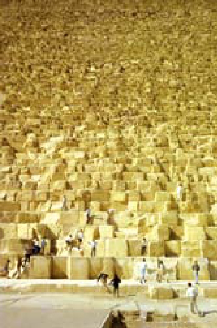 在3座金字塔中最大的是胡夫金字塔,它是一座几乎实心的巨石体,用200多万块巨石砌成。最初铺盖金字塔外层的灰白色石灰石已经全部脱落,如今只能见到内层黄色的石块。金字塔中心有墓室,可以从甬道进去,墓室顶上分层架着几块几十吨重的巨石。金字塔的旁边还有一些法老和贵族的小金字塔以及长方形台式陵墓。