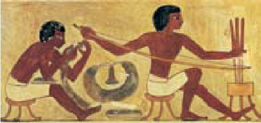 随着埃及人对各种装饰品需求量的增加,制作各种饰品的作坊也应运而生。图为埃及人正在制作项链。