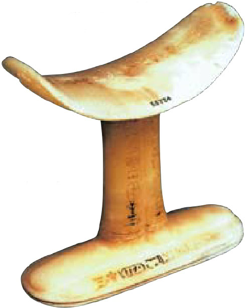 枕头的造型非常奇特。枕面如同张开的双手,下面细细地描出人的手指;支撑柱模仿的人的双臂,下部则变成脚踝,底座则如同两只后跟相抵的脚。