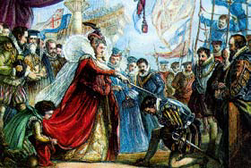 海盗头子德雷克因在打击西班牙的海盗事业中的杰出表现,成为伊丽莎白女王的宠臣。德雷克1581年环球航行归来之后,被授予骑士称号。