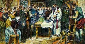 虽说伊丽莎白一世对清教徒的迫害贯彻始终,但英国的清教徒人数却是有增无减。实际上,清教徒运动是新兴资产阶级对信仰自由,要求反抗封建专制的一种呼声,也表达了一种积极进取的生活态度,因而是顺应了历史潮流的产物。到后来就连英国国会中都有很多清教徒的支持者。1603年,伊丽莎白女王去世,英格兰王位由苏格兰的玛丽女王的儿子詹姆士接任。詹姆士一世自小接受新教的长老会教育,英国的清教徒们对他的到来寄予了很高期望。可是事实情况却与他们的期望相反,詹姆士一世却因小时在苏格兰受尽长老会领袖的气而对清教徒无甚好感,现在好不容易可以自己做主,岂可如此轻易地拱手让人。而这些,却是清教徒们并不知道的。他们大胆地在1604年的议会中,发动上千人联名上书,这便是著名的“千人奏书”,请求詹姆士一世简化崇拜仪式,并修改公祷书的部分内容。