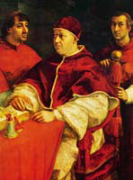 意大利拉斐尔绘,意大利佛罗伦萨乌菲兹美术馆藏。画面正中为教皇利奥十世,左右两边是两位红衣主教。