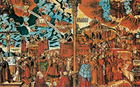 画中右边的是德国天主教会,左边是马丁·路德所改革的新教。马丁·路德领导的宗教改革使德国出现了天主教和新教两个对立的教派。