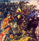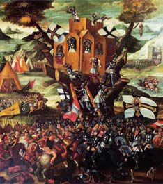 这幅17世纪初的绘画,描绘了13世纪土耳其军队与德意志条顿骑士团之间的战争场景。从图中可以看到德意志骑士手中拿着标有条顿十字纹章的旗帜。