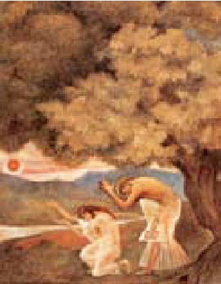 公元前14世纪墓穴壁画:奥西里斯头顶埃及王冠,手持象征王权的长钩和连枷,身上如木乃伊一样裹着白布,象征着死亡。奥西里斯原本是农业和植物之神。古埃及法老在世之时,奥西里斯神被视为太阳神拉的化身,死后则统治冥界。作为冥界的统治者,奥西里斯要为每一位初到冥界的死者主持审判。