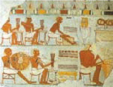 古埃及壁画:加工珠宝的作坊。工匠们为宝石穿孔,他们把打磨光滑的珠子串成项链。图中右下角的冶金工人在用吹管吹旺炉火。