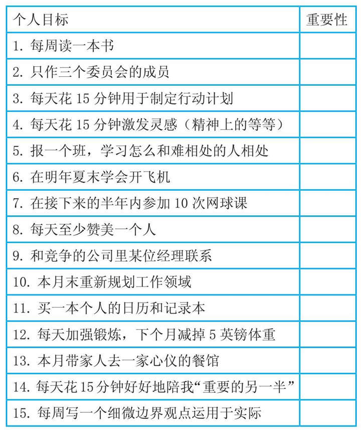 使用 A-B-C 要务分级系统可以让你避免把所有活动和项目都贴上绝对重要的标签。相反,你把它们分成了 A-B-C 三大类。为了把这个方法用于实践,下文提供了一个范例,列举了 15 个你可能会有的目标。浏览一遍,用 A-B-C 的办法按照你认为的相对重要性把它们划分好。
