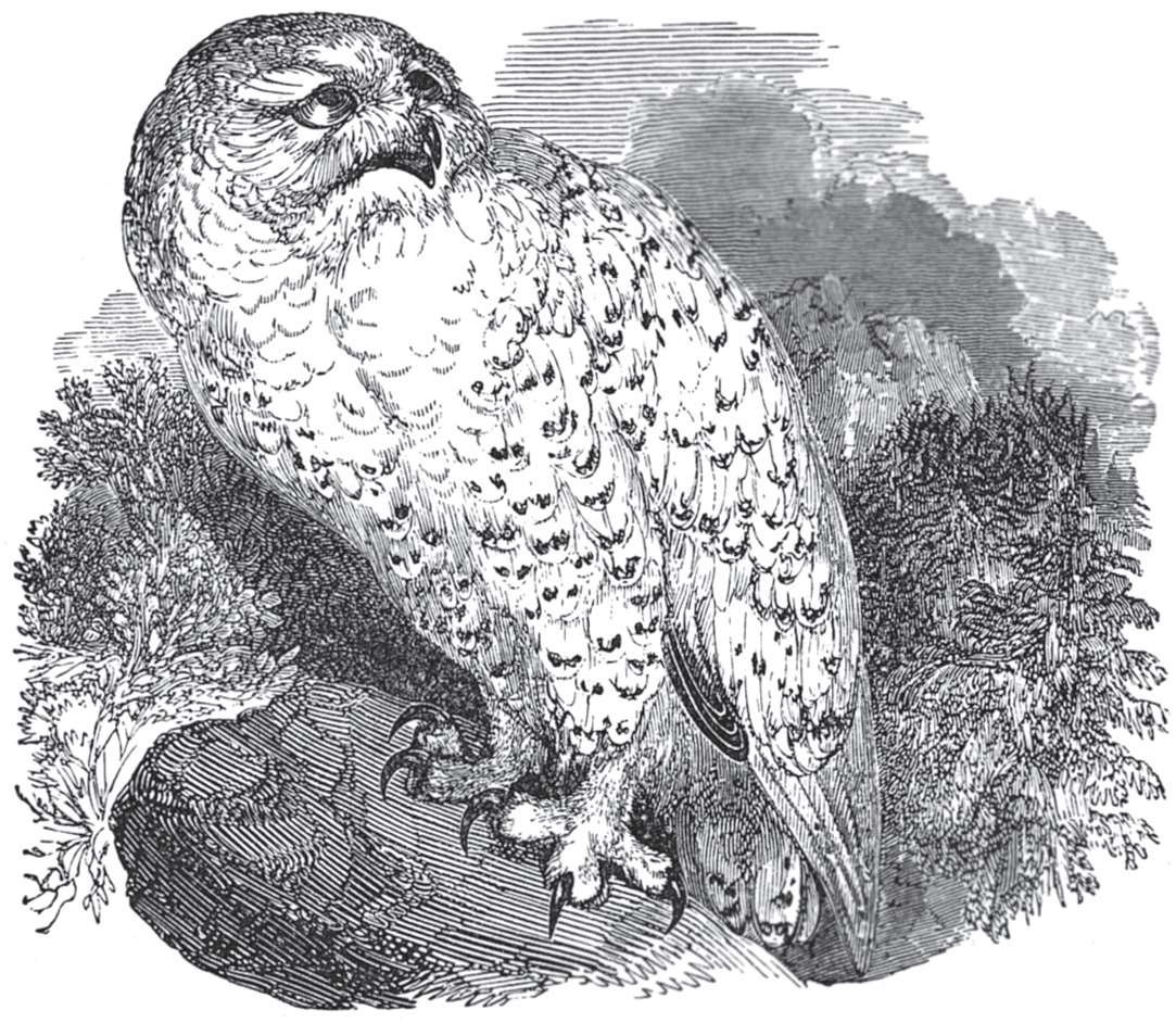 8. When this owl is caught and put into a cage, he does not sit on his perch or hide away in the dark corners during the daytime, as other owls do. He often comes down to the ground, and remains near the front of his prison even in broad daylight; for he can see as well in daylight as in the dusk