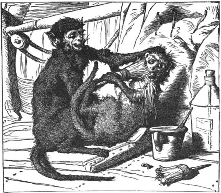 “One of his drollest tricks was performed on the poor little monkey that was left. One day, the men who had been painting left their paint and brushes on the upper deck. Jack enticed