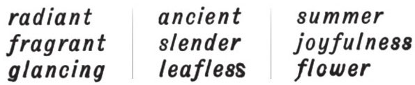 sun´-ny crim´-son pea´-cock joy´-ful-ness liv´-ing