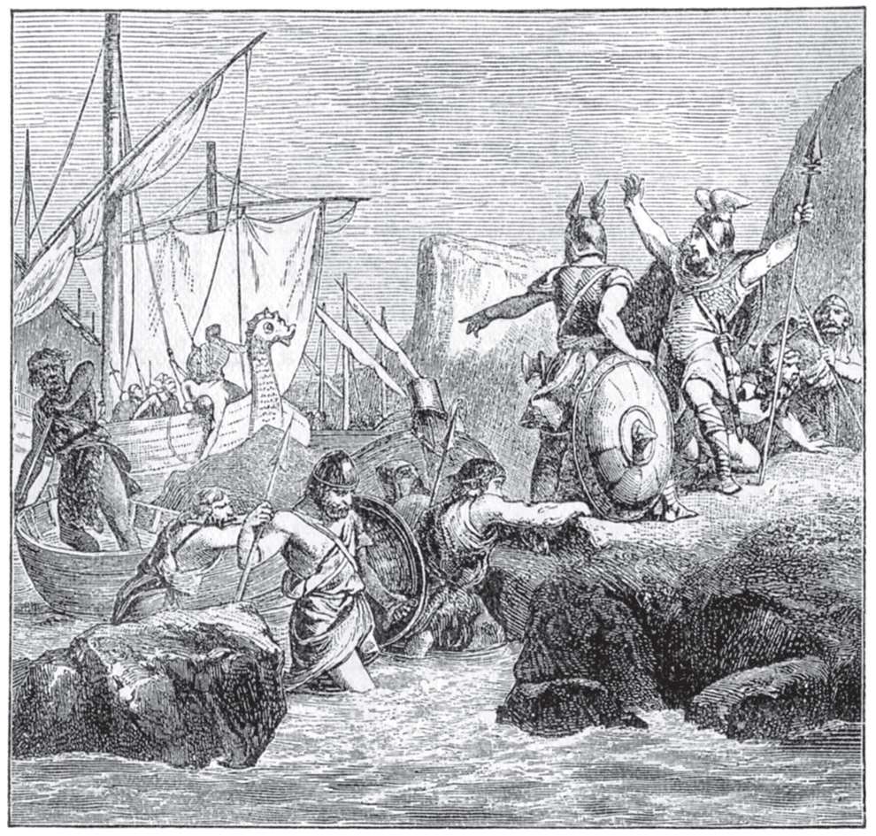 1. Some years after the Roman soldiers had finally left the island, there came to the coast of Britain three keels, or ships, filled with men called Jutes, who, in addition to the usual swords and spears, carried axes and great steel hammers for attacking their enemies. Their leaders were called Hengist and Horsa; and their banner bore the figure of a white horse. They came just at the right time. A struggle for power had been going on between the Britons of the South and the Picts and Scots, and the former were in great need of help.