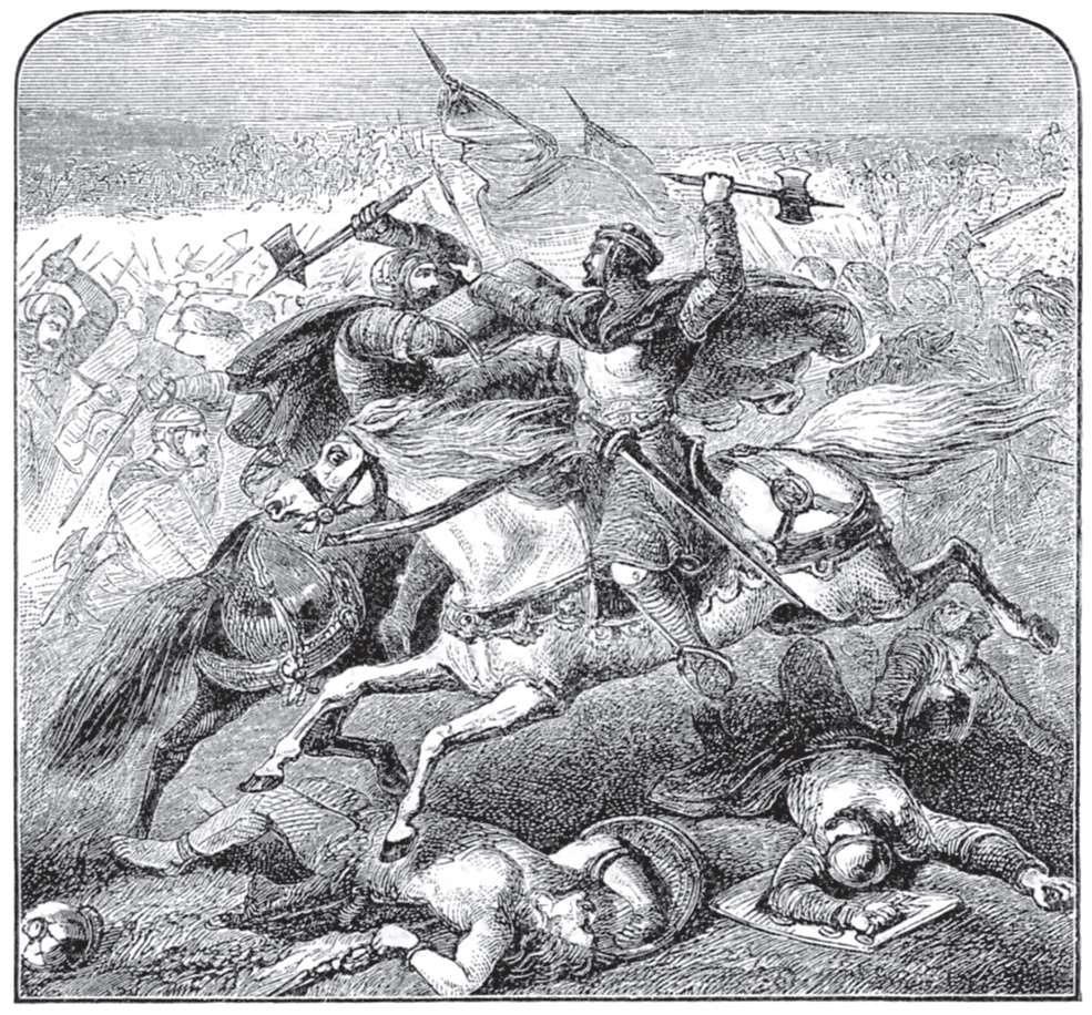 in Dorsetshire. The Welsh were posted on the side of a hill, and the English were in the plain below. The Welsh first sent a flight of arrows among the English, and then swept down on them furiously. Arthur met the English leader in single combat, and cleft his skull with his battle-axe. When they saw their leader fall, the