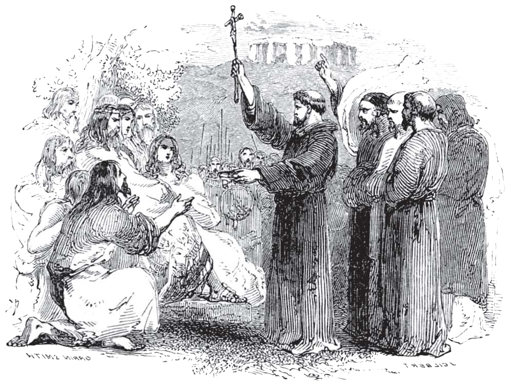 4. When they came in sight, it was seen that a picture of a Man bleeding on a cross was carried before them, and that each longrobed foreigner held a silver crucifi x in his hand. Nothing could be kinder than the way in which Æthelbert received the strangers; and as soon as they declared the object of their coming, he gave them houses to live in and money for their regular support. Nor was it long until he yielded to the quiet infl uence of his wife Bertha, and was baptized into the Church of which Augustine was a missionary.
