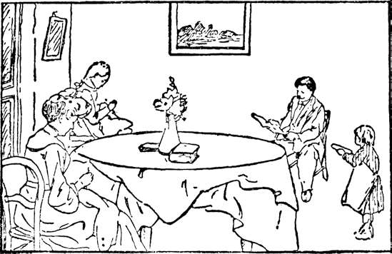 The father is reading. He is sitting in his chair. The mother is sitting in her chair. The girl is sitting also. The boy is standing.