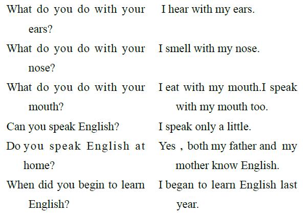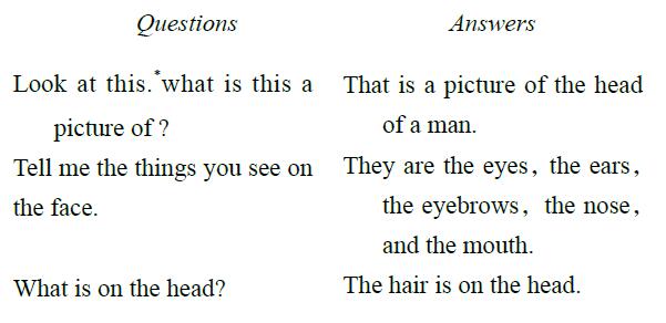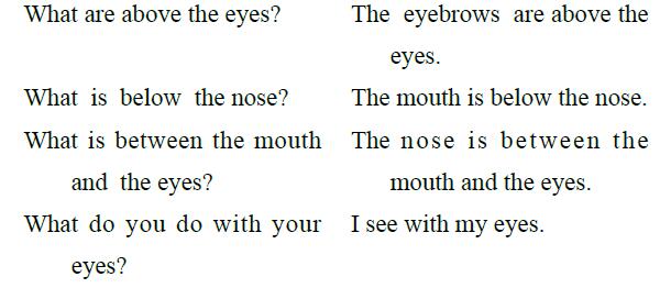 How many eyes have you? How many ears have you? How many eyebrows have you? Point to your nose. Point to your mouth.