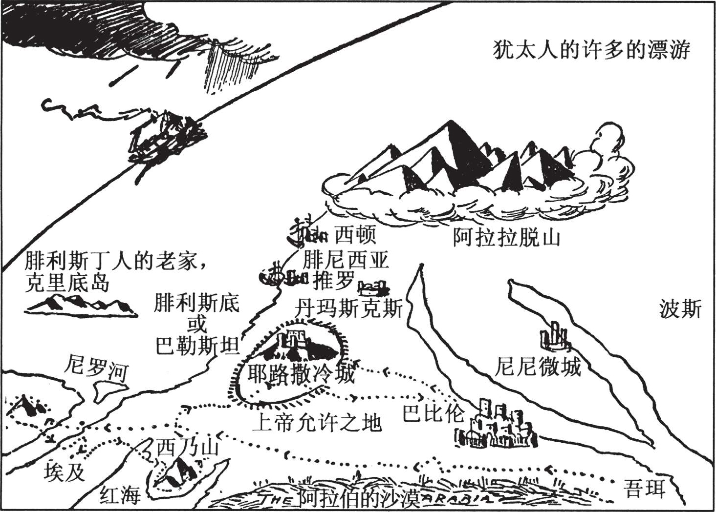 摩西吩咐以色列人继续他们在沙漠上的行程,又告诉他们哪样可吃,哪样可喝,哪样应该回避,以免在炎热的天气里生病,他们都一一服从了他。后来经过许多年的漫游,犹太人终于来到一块快乐而富饶的土地。此地名为巴勒斯坦,意思是“皮利斯塔人的国度”。皮利斯塔人属于克里特人的一支,他们被赶出自己的海岛后,就在西亚海岸定居下来。很不幸的是,此时的巴勒斯坦内陆已经被另一支闪米特部族迎南人占据。然而犹太人奋力冲开道路,进入山谷,建立起许多城市。他们修筑了一座敬奉耶和华的宏伟庙宇,并将庙宇所在的城市命名为“耶路撒冷”,意思是“和平之乡”。