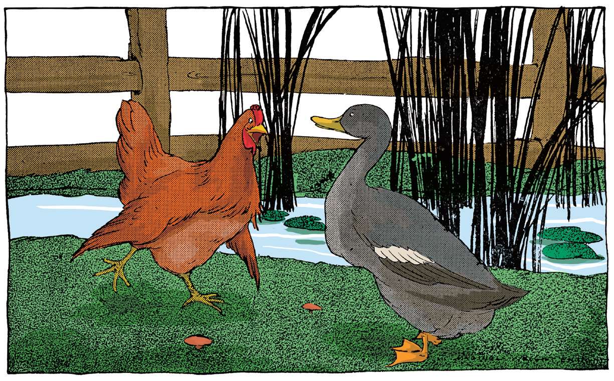 Gray Duck said, “Quack, quack! Good morning, Red Hen.”