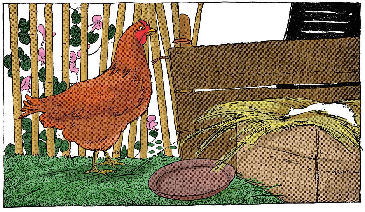 Red Hen said, “Cluck, cluck! Oh, I am so frightened! There is something white in my nest.”