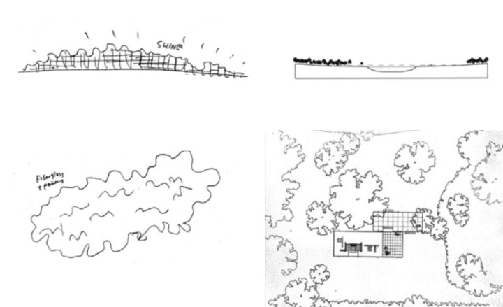妹岛和世蛇行画廊的设计草图(立面,平面)与法恩沃斯住宅的对比,妹岛和世甚至用文字道出了她对这一项目核心观感的预期——“Shine”