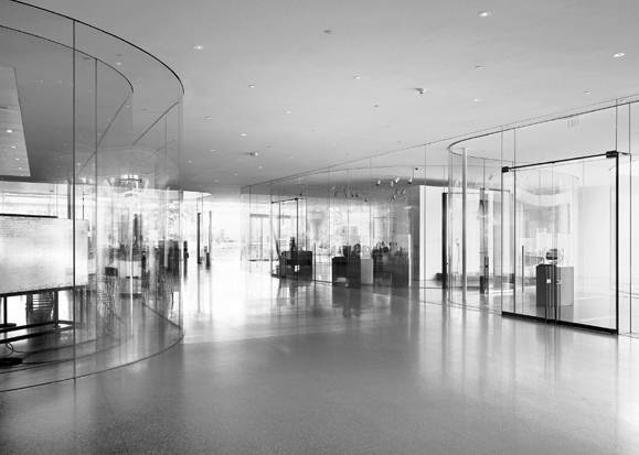 放眼望去,室内看不见明显的台阶,只有地板逐渐高低变化;视线所及之处,实在也谈不上真正的“墙”,因为在进深方向上,就像玻璃博物馆那样,所有的隔断都转弯了──投射在或通透或者半透的表面上,经意或是不经意的眼光都像是打了一个滑溜,所有的空间看过去都在扭转之中,它们连续、波折、重叠了。因此人们难以一下判断这光学魔术的实体结构,它实在是一座“隐隐约约”的建筑。