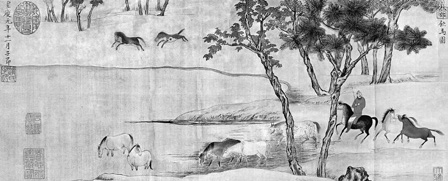 《秋郊饮马图》卷局部,元赵孟頫作,绢本设色,23.6 cmX59 cm。台北故宫博物院藏