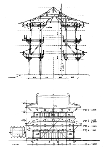 陈明达对于独乐寺立面构图与模数构成的分析。柱间距是是中国古代木构设计的基本模数,但是由于众多其他设计条件(比如楼阁各层衔接的特殊构造)的存在,这个数字需要经过一系列复杂的调整