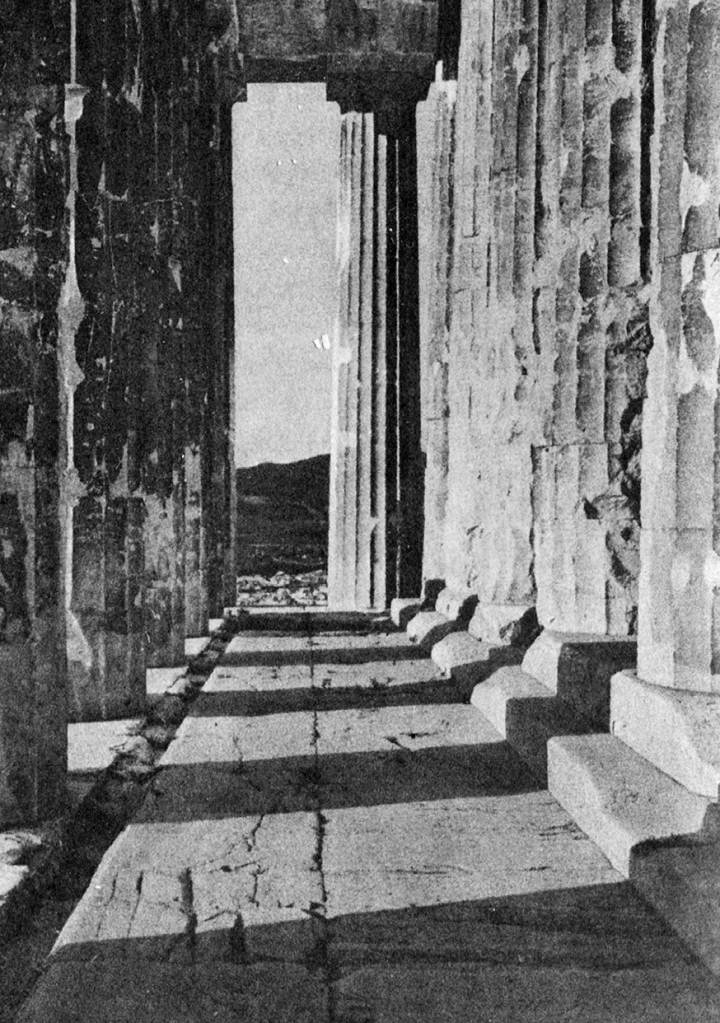 如果不是凑巧可以利用山体岩穴这样的天然结构的话,我们见到的大多数建筑物都由垂直和水平结构共同组成,通常前者是墙和柱子,后者则是平或坡的屋顶。在人类建筑历史的早期,人们尚无法想象能像妹岛这样“玩儿”柱子(也难怪,1956年出生的她本是在战后小小玩具屋般的住宅中看电视长大的一代), 帕特农神庙粗壮的结构体系和“凉亭”的柱网也许是两个极端:相对于建筑所占的面积而言,希腊神庙柱廊的空隙很小,垂直结构通常做得非常结实,里面几乎放不下什么东西,相形于妹岛的“有间”,也许可以叫做“无间”。