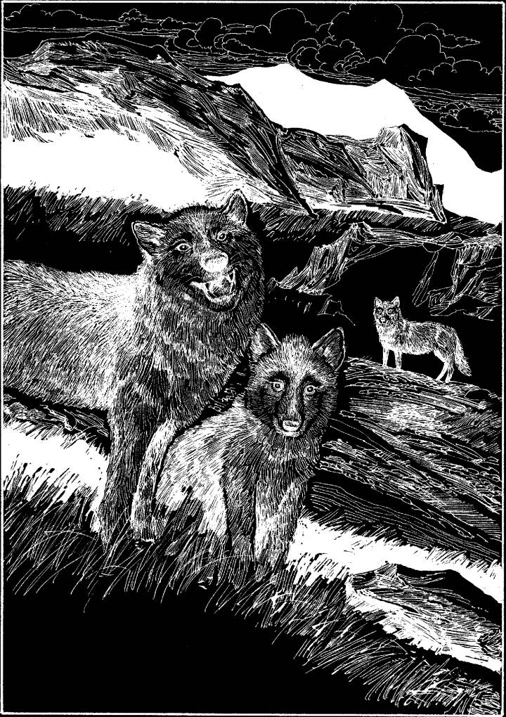 那天,紫岚拖着一只雪雉回窝,转过山岬,远远便望见黑仔站在石洞口,藤萝上白色的小花把它衬托得格外醒目。紫岚又惊又喜。惊的是黑仔违背了它的一再告诫没藏在石洞深处耐心等它捕食回来,而是跑到洞口来了,洞外是弱肉强食的世界,处处暗藏着杀机,随时都有可能遭遇不测;喜的是黑仔果然不同凡响。一般情况,半岁龄的幼狼,爪牙都还软弱,离开了母狼的监护,是不敢出窝的,往往还会表现出过分的机警和谨慎,须听到它熟悉的叫唤声,须闻到它熟悉的气味,才肯从洞内跑出来争享它带回的猎物。这种谨慎要持续到一岁以后,随着爪牙逐渐锋利,扑咬技艺日臻完善,幼狼才敢独自跑出巢穴。