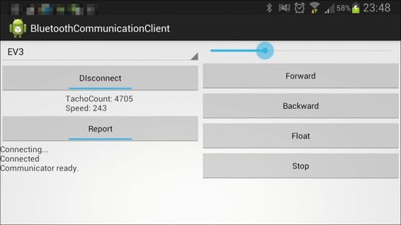 首先是发送命令的时机。在没有新的命令到达时,机器人将维持上次命令给出的速度和转向角进行移动,所以,理论上只要速度或者转向角发生了变化,就应该发送新的命令。在我们的手机端程序中,速度通过拖动纵向SeekBar来改变,转向角由手机的倾斜变化来改变。两者都可能在很短的时间内发生很多次改变。例如,用手指缓慢地推动速度设置条,其中的数值就会不断地变化;同样,手机倾斜时,倾斜角在整个转动过程中都是不断变化的。如果在数值发生变化时就向机器人发送命令,就会出现瞬间产生巨量命令的情况。这无论对EV3的处理能力还是蓝牙网络的吞吐量都是一个极大的挑战。实际测试的结果也证明,这种方式会因为命令无法得到及时处理产生命令的延迟执行。例如,手机端已经将速度提到最大,机器人却还在缓慢地加速。显然,这不是我们所期望的结果。