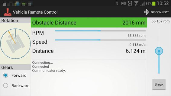手机上实时显示小车的电动机转速、速度和行驶里程。