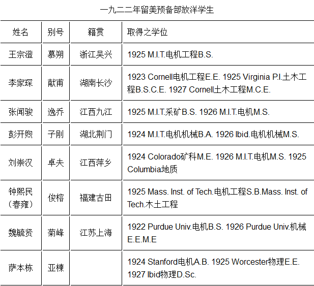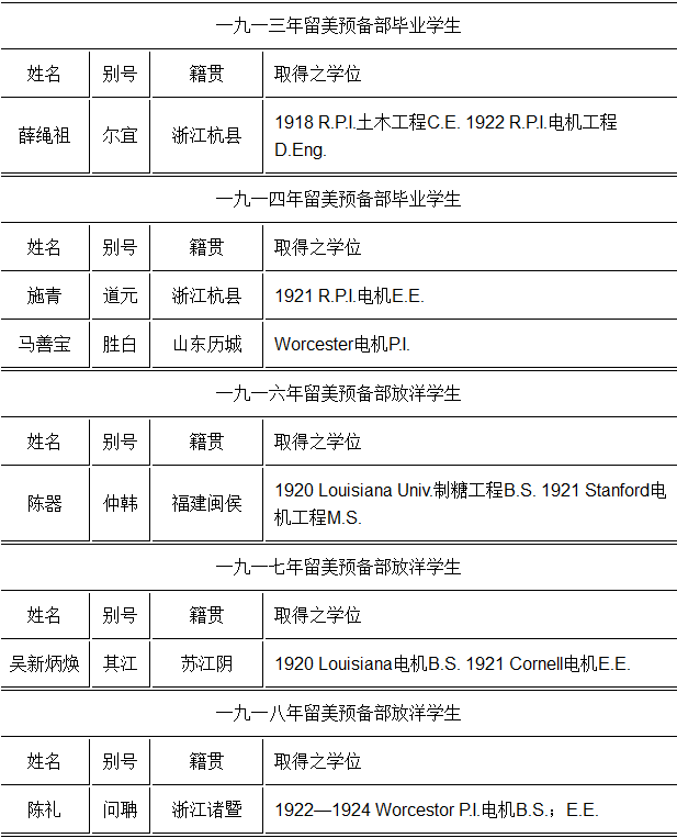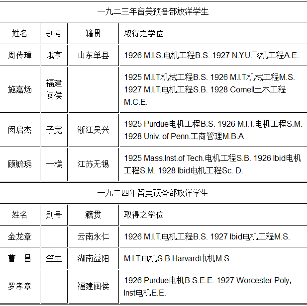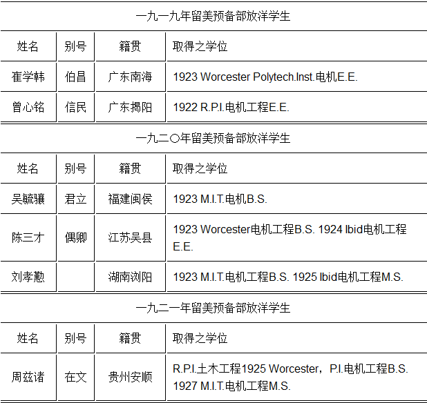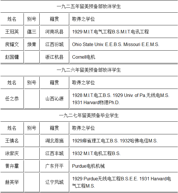 此外,1911年游美学务处挑选了胡光麃等一批幼年生,但因辛亥革命爆发未能按期派出,时局稳定后方才赴美。1916年后,清华学校开始招收一些专科生赴美留学,“招考对象是曾在国内采矿、电机、机械等各专门学校毕业,能直接进入美国大学院(Post-Graduate Course)各专科研修高深学问者” [17] ,“各生到美后应即入先时认定之大学进修各该专科非经监督处 核准不得改换学校或改习科目” [18] 。初期的几批基本按这一要求,如1916年10人中8人选习工科(2人选习电机工程),1917年7人均选习工科(1人选习电机工程)等 [19] 。但20世纪20年代中后期专科生的招考科目逐渐发生了变化,如,1925年留美专科生“学额:有理科(物理,生物),工程科学(土木,机械,电机),教育科,商业经济科,历史科五种。选录五名” [20] ; 1927年清华学校招考赴美留学专科生门类及名额包括“西洋文学门、哲学心理学门、数学门、地学门、化学门、生物学门,学生资送赴美留学择优录取,以五名为限” [21] 。可以看出,这一时期专科生的招收范围较之前已发生了变化,选习工科的学生人数亦相应减少,如1925年5人中1人选习工科,1927年5人中无人选习工科 [22] 。据有关资料记载,清华学校时期留美专科男生中选习电机工程的有许坤、裘维裕、沈良骅、杨肇熑、薛绍青、王崇植、诸水本、朱物华、许应期等 [23] 。此外,在直接考送各类留学生之余,清华每年还利用庚款资助部分在美留学自费生及官费生(统称清华津贴生) [24] ,其中选习电机工程的有娄昌后、郑允衷等 [25] 。