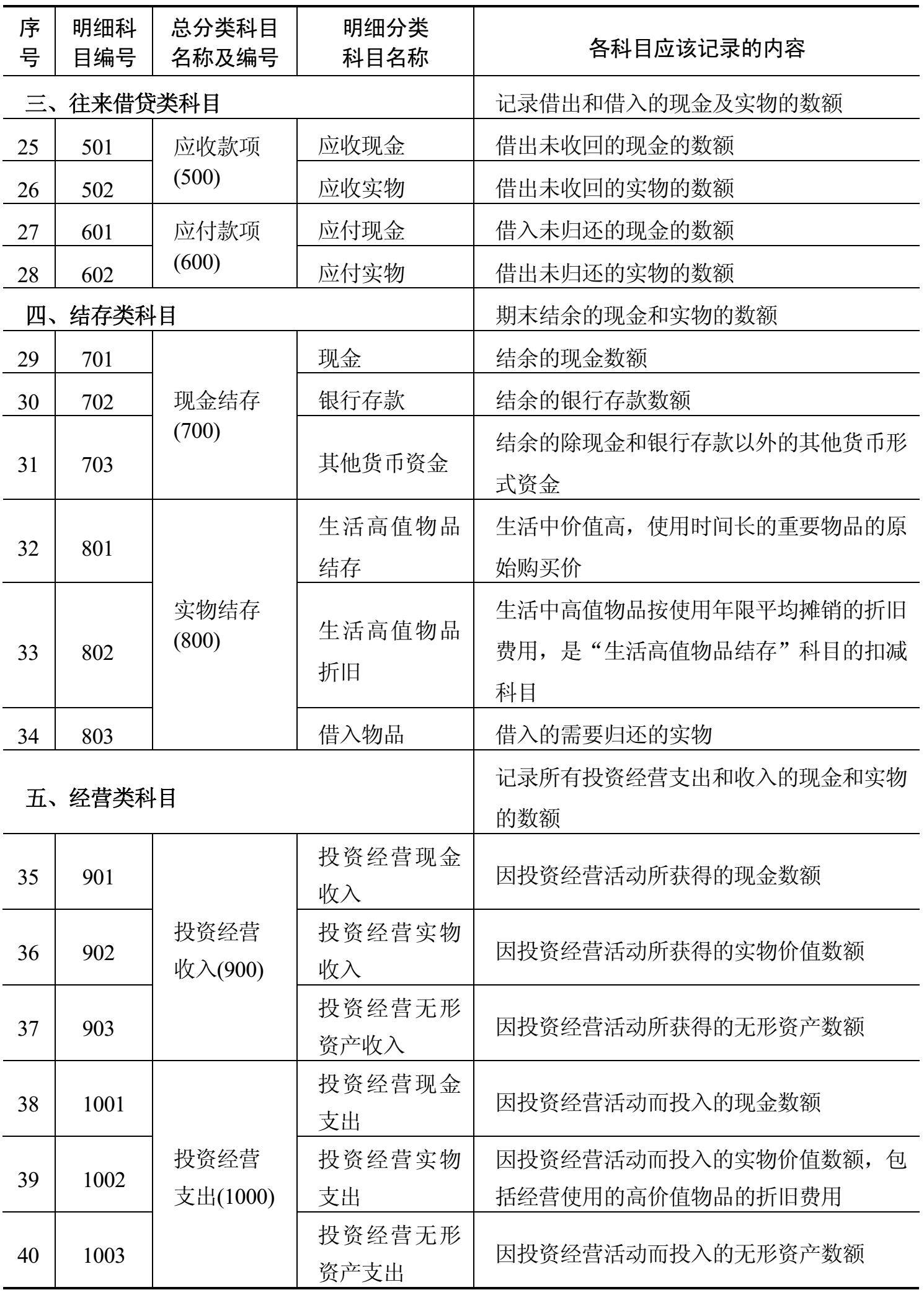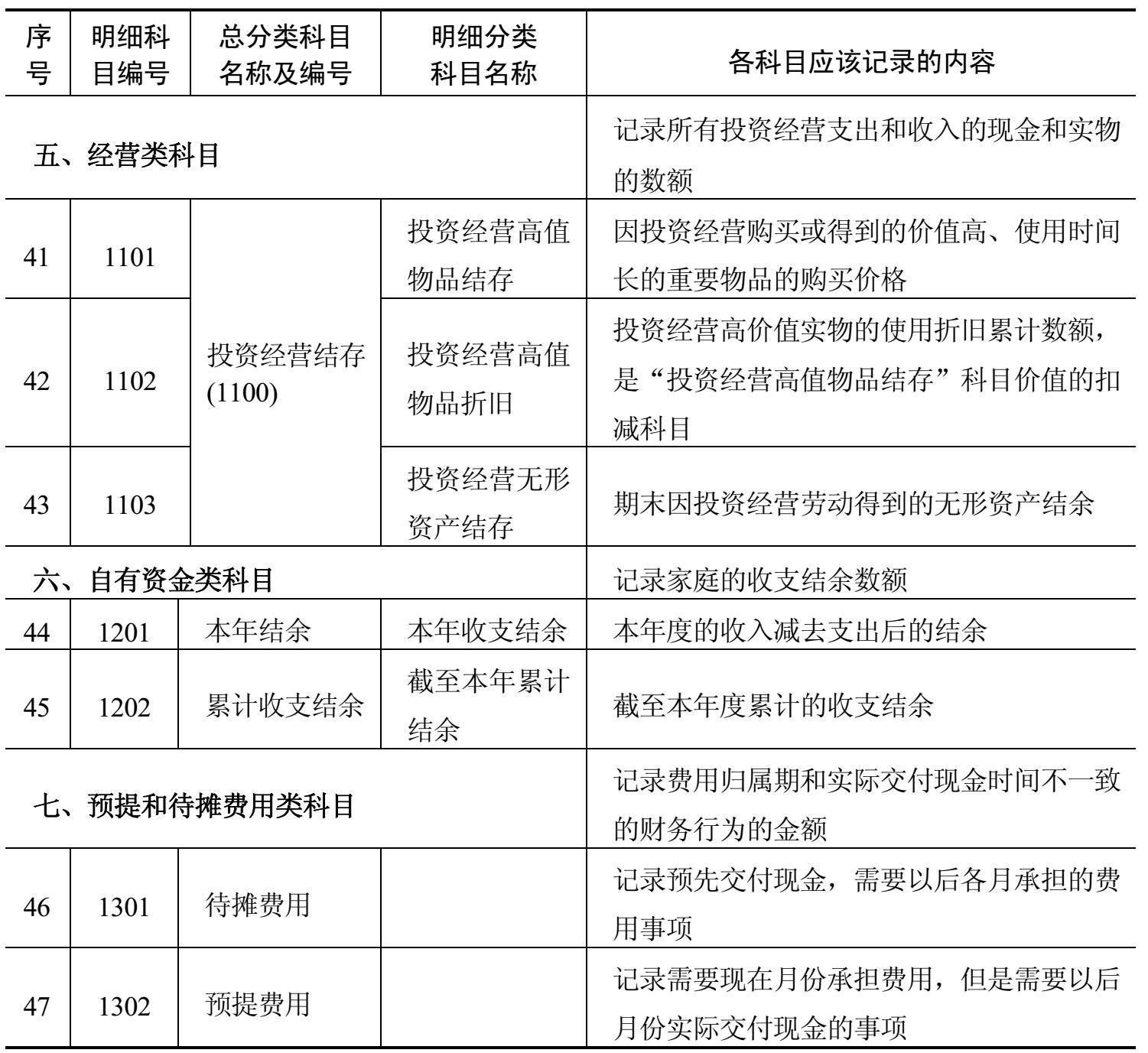 有些家庭为了填补家用,可能会做点小买卖,规模很小,为了正确记录这类经营业务的情况,根据业务特点设置了科目,总分类科目包括“投资经营收入”、“投资经营支出”、“投资经营结存”。