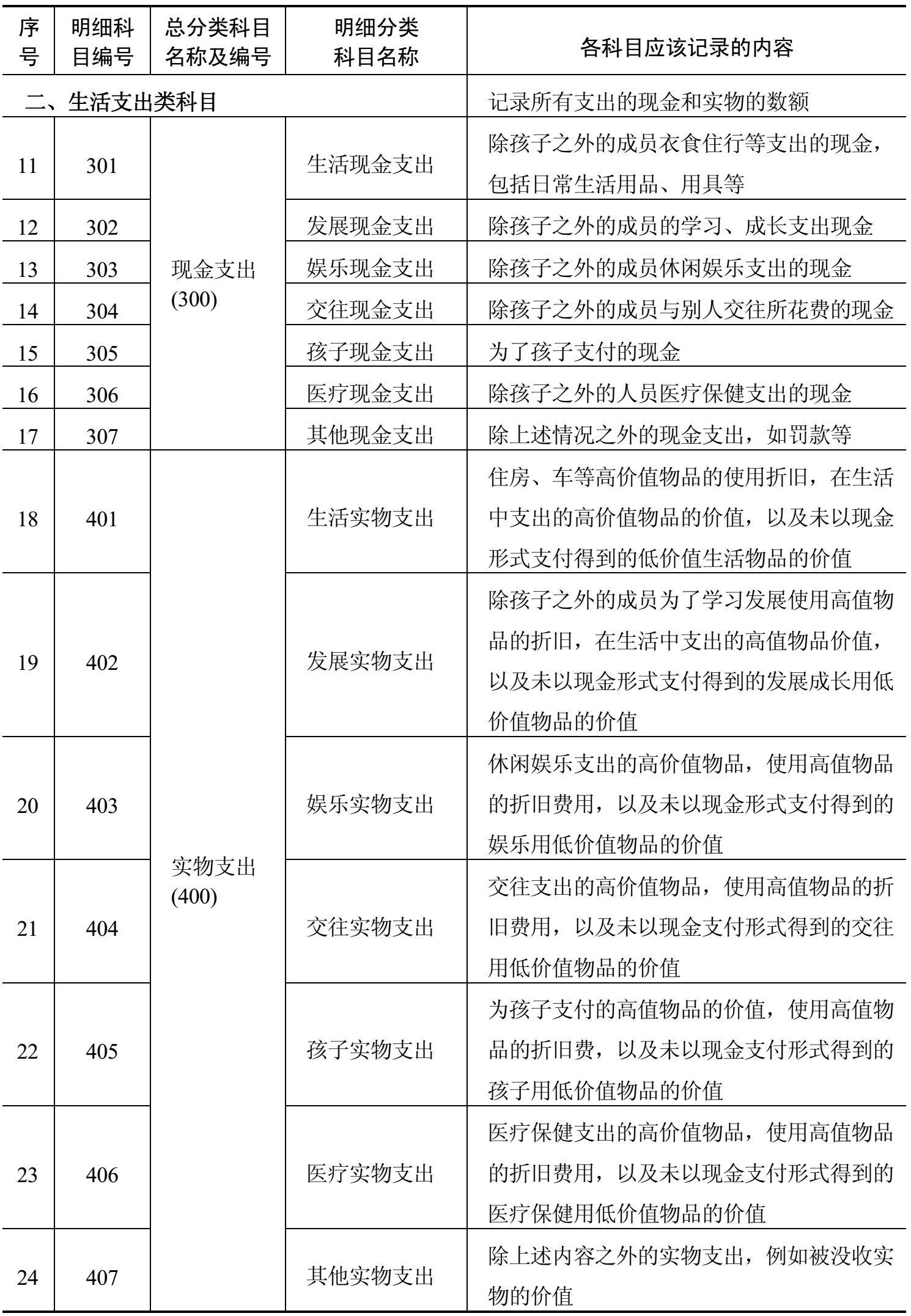 (1)“生活现金支出”:除了孩子之外的其他家人的衣、食、住、行等一切生活的现金支出。此外,为孩子支出的现金,如果不能确切分辨,也可记录在此分类中。