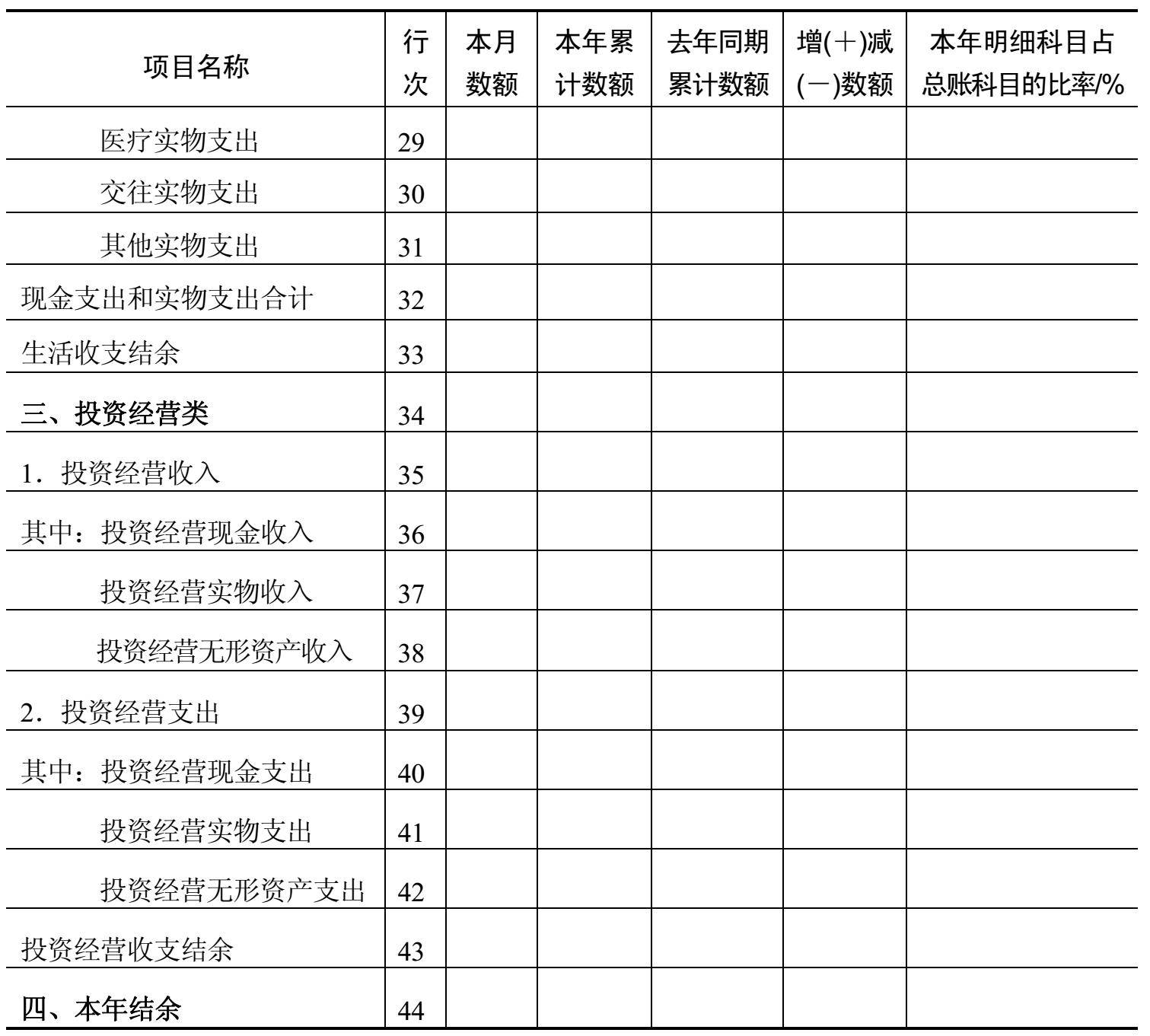 “本年结余”=(“现金收入”+“实物收入”)-(“现金支出”+“实物支出”)+ (“投资经营收入”-“投资经营支出”)