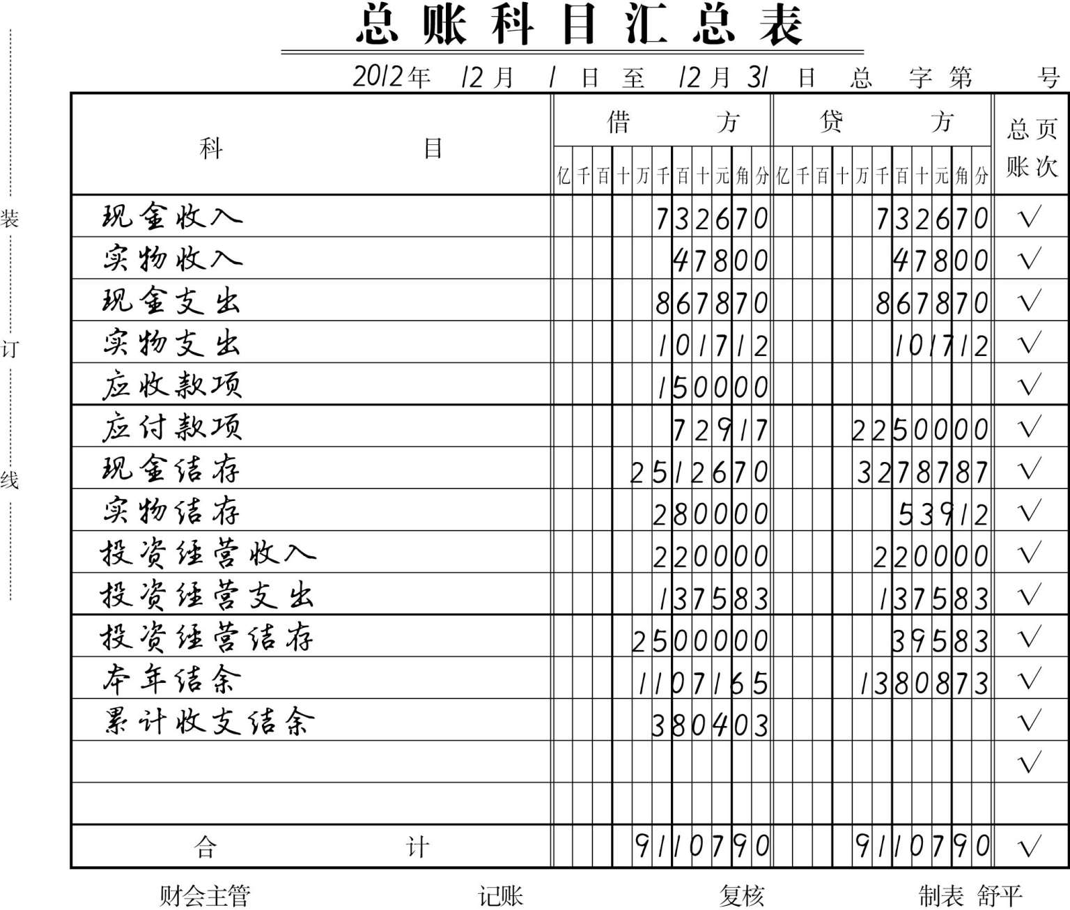 把本月对应明细科目的借方发生额、贷方发生额进行合计,从而确定出总账科目本月的借方发生额、贷方发生额。将全部总账科目的借贷方发生额确定完毕后,编写一个“总账科目汇总表”,然后将各总账科目的借贷方发生额抄写在对应的总账账页上,最后分别计算出借贷方发生额的累计数和余额。图2-6是一张填好的“总账科目汇总表”,以2012年12月份的“总账科目汇总表”为例,展示“总账科目汇总表”的格式。在第三章中将介绍“总账科目汇总表”的具体应用。