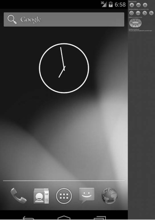 对于Android程序的开发者来说,模拟器的推出给开发者在开发和测试上带来了很大的便利。无论在Windows下还是Linux下,Android模拟器都可以顺利运行,并且官方提供了Eclipse插件,可以将模拟器集成到Eclipse的IDE环境。Android SDK中包含的模拟器的功能非常齐全,电话本、通话等功能都可正常使用(当然你没办法真的从这里打电话),甚至其内置的浏览器和Maps都可以联网。用户可以使用键盘输入,鼠标单击模拟器按键输入,甚至还可以使用鼠标单击、拖动屏幕进行操纵。模拟器在电脑上模拟运行的效果如图3-37所示。