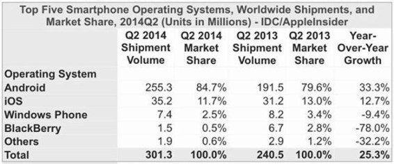 从2011年第一季度开始,Android在全球的市场份额首次超过塞班系统,跃居全球第一。2014年8月15日,根据IDC发布的2014年第二季度智能手机市场的最新数据显示,苹果iOS和谷歌Android两大系统平台继续领跑。Android阵营增长则更惊人,达到了33.3%,出货量达到了2.553亿台。Android系统的市场份额得到了提高,从2013年第二季度的79.6%增长到了2014年第二季度的84.7%。具体信息如图1-7所示。