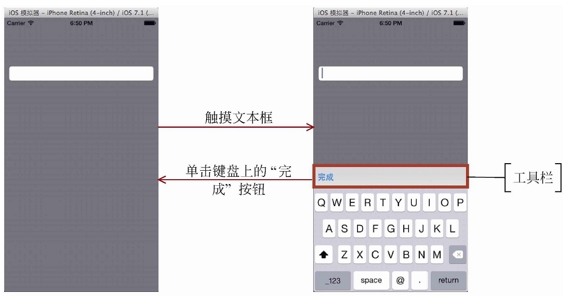 【示例2-18】 以下就是为键盘添加工具栏,在工具栏中有一个“完成”的按钮,单击此按钮后,键盘就会隐藏。代码如下: