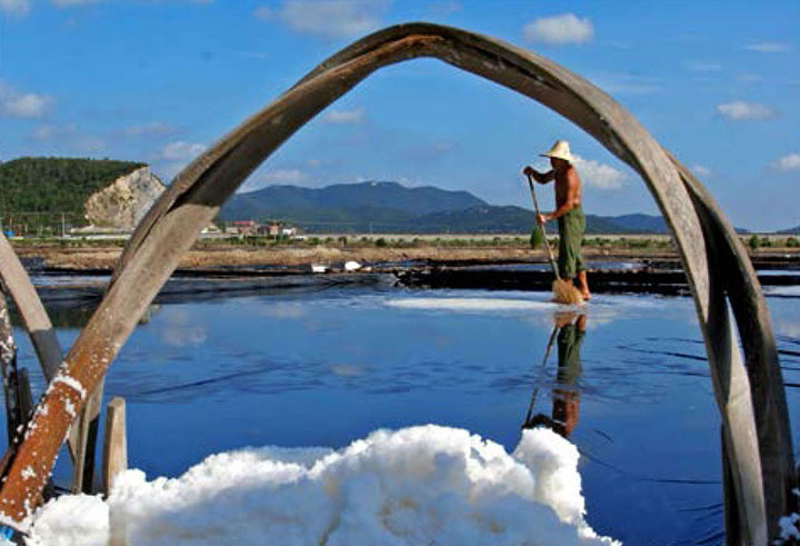 海水是由食盐和其他物质溶化在水中而成的一种溶液。制作食盐的盐田通常会把海水引入到岸边修建的很多像稻田一样的池子里。经过太阳的曝晒,海水中的水分蒸发,食盐就会渐渐地沉积在池底,形成白色的颗粒,这就是食盐结晶,食盐结晶达到一定程度就可以收集了。我们在家里也可以把装有盐水的盘子放在阳光底下晒,几天后你就可以看见沉积在盘底的食盐了。