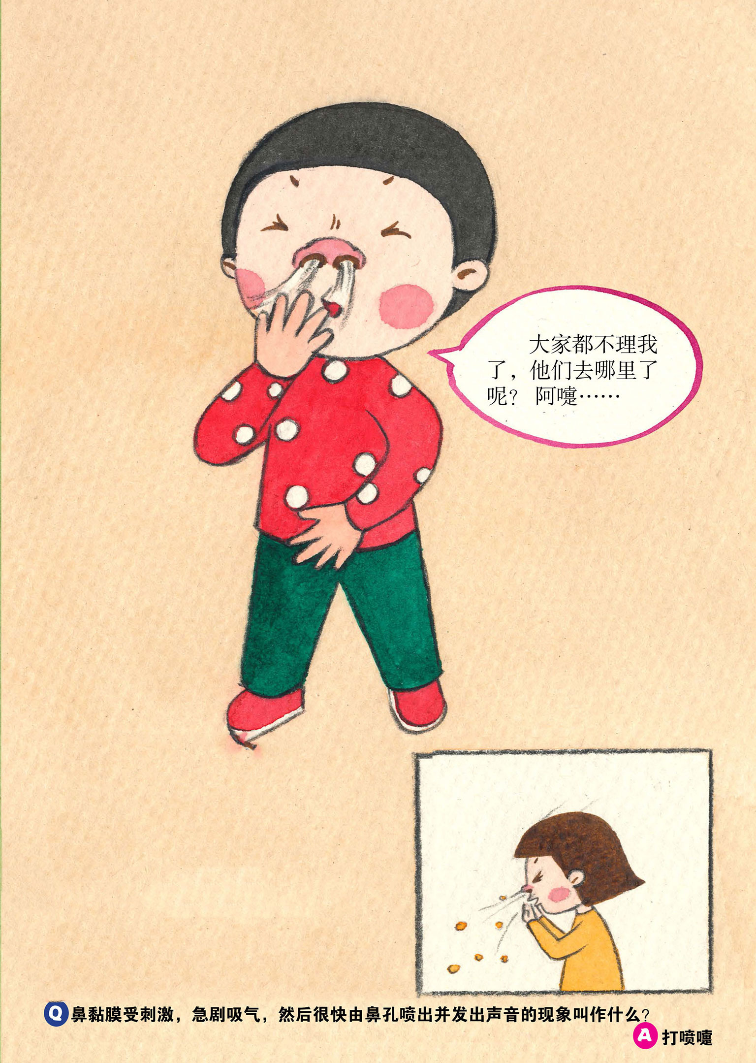 喷嚏是鼻黏膜受刺激,急剧吸气,然后很快由鼻孔喷出并发出声音的现象。打喷嚏时,我们会以非常快的速度呼气。平常我们呼出的气时速为10千米~20千米,而在打喷嚏时,时速可以达到320千米左右,咳嗽时,呼气的时速能达到200千米~400千米。台风时速是120千米左右,所以,打喷嚏的速度约是台风速度的3倍。