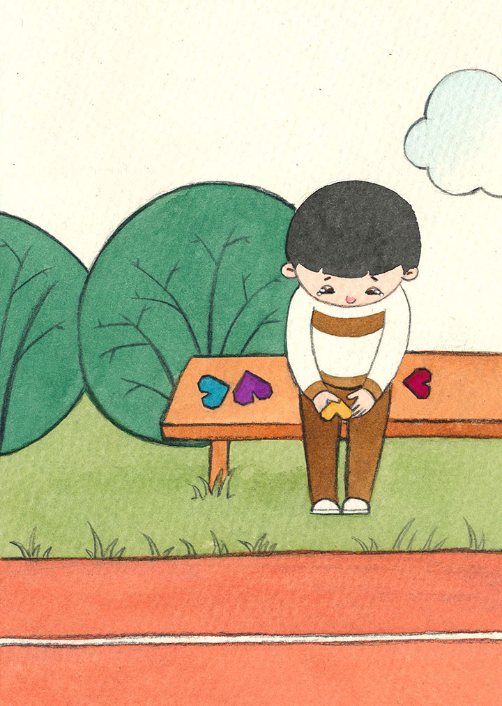 有一个小男孩正孤独地坐在长条椅上,