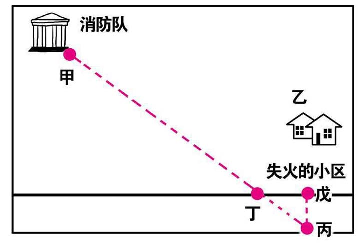 如图,设消防队在甲点,失火的小区在乙点,乙相对于河边的对称点在丙点,连接甲和丙,交江边为丁点,则甲——丁——乙为取水救火的最短路线。