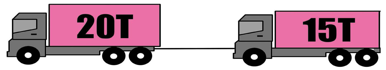 一辆汽车坏了,被另一辆汽车用钢索拖着前进。但在行进中,路遇一座桥梁。桥头的标志牌上写着:最大载重量30吨。然而,前面的汽车重20吨,后面坏了的汽车重15吨,明显超出了桥的载重量,又不能将两辆车分开,这可难住了两位司机。小朋友,你能想出好办法帮助他们通过这座桥吗?