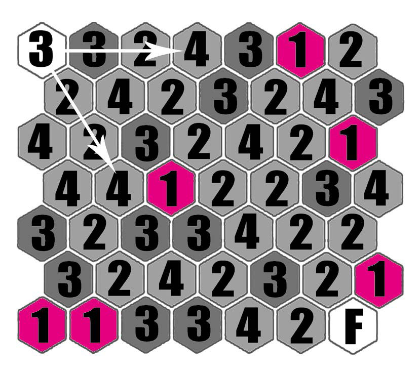 你要在这个迷宫中,走到标示着“F”的终点。并且你只能直线前进,图中每个格子里面的数字代表下一步你可以走几格。从左上方的“3”处开始,如图所示,下一步你只有两种走法。