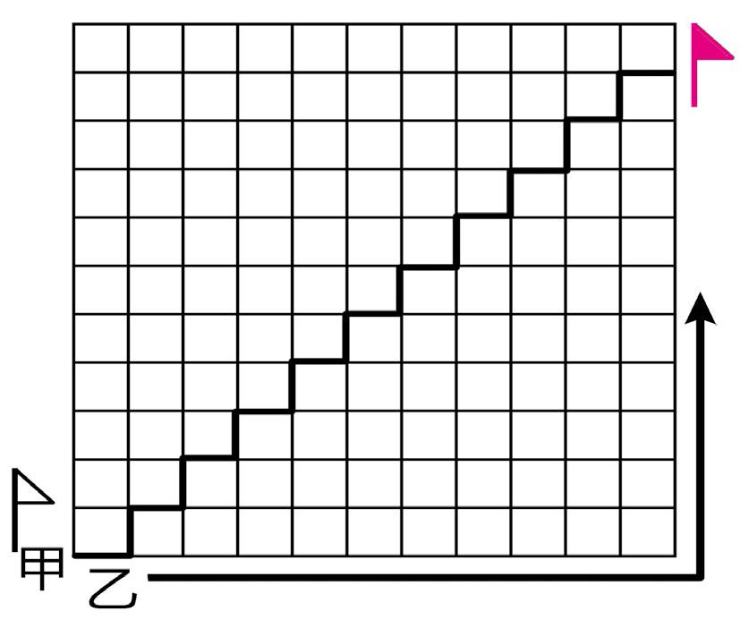 一座小城里有许多纵横交错的街巷。皮皮、琪琪两人要从甲处出发步行到乙处,琪琪认为沿着城边走路程短些,皮皮认为在城里穿街走巷路程短(如图所示)。