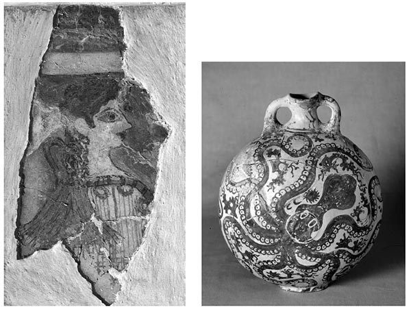 这条弯曲的章鱼和克里特岛上的克诺索斯的米诺斯王宫墙上这幅壁画的细节,也许都是公元前十五世纪所画。从现代的眼光来看,这个妇女轮廓清晰、迷离的眼神给了她一种调皮的表情。然而,米诺斯艺术的常规可能已经使当初的欣赏者免于对此类奇异现象。一个从正面看到的眼睛却被画在面部侧面的轮廓向中,产生任何这样的反应,因为庄严和神圣也许是画家真正所要表现的主题。但如果我们将赫梯沉闷的艺术风格拿来同米诺斯艺术常规所要求的微小的敏锐做一比较,则二者鲜明的对照确实反映出了一种根本的区别:一方面是公元前两千纪以陆地为基础的军事帝国,另一方面是靠海洋获得财富以维持其欢乐生活的自由自在的民族。