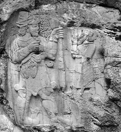 这幅图刻描绘了国王(右侧较小的人像)正在为他的臣民向植物神作祈祷。美索不达米亚艺术影响的痕迹很容易从国王穿戴的样式和雕刻者对胡须和头发的处理方式上清晰地分辨出来。但图中人物那臃肿矮胖的体态仍然保持着赫梯艺术的特点。